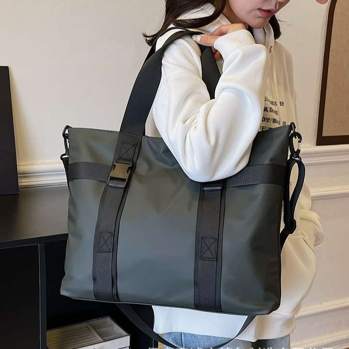 スーツケースのキャリーバーに固定できる便利なトートバッグです。背面のベルト部分でキャリーオンバッグとして使用可能。