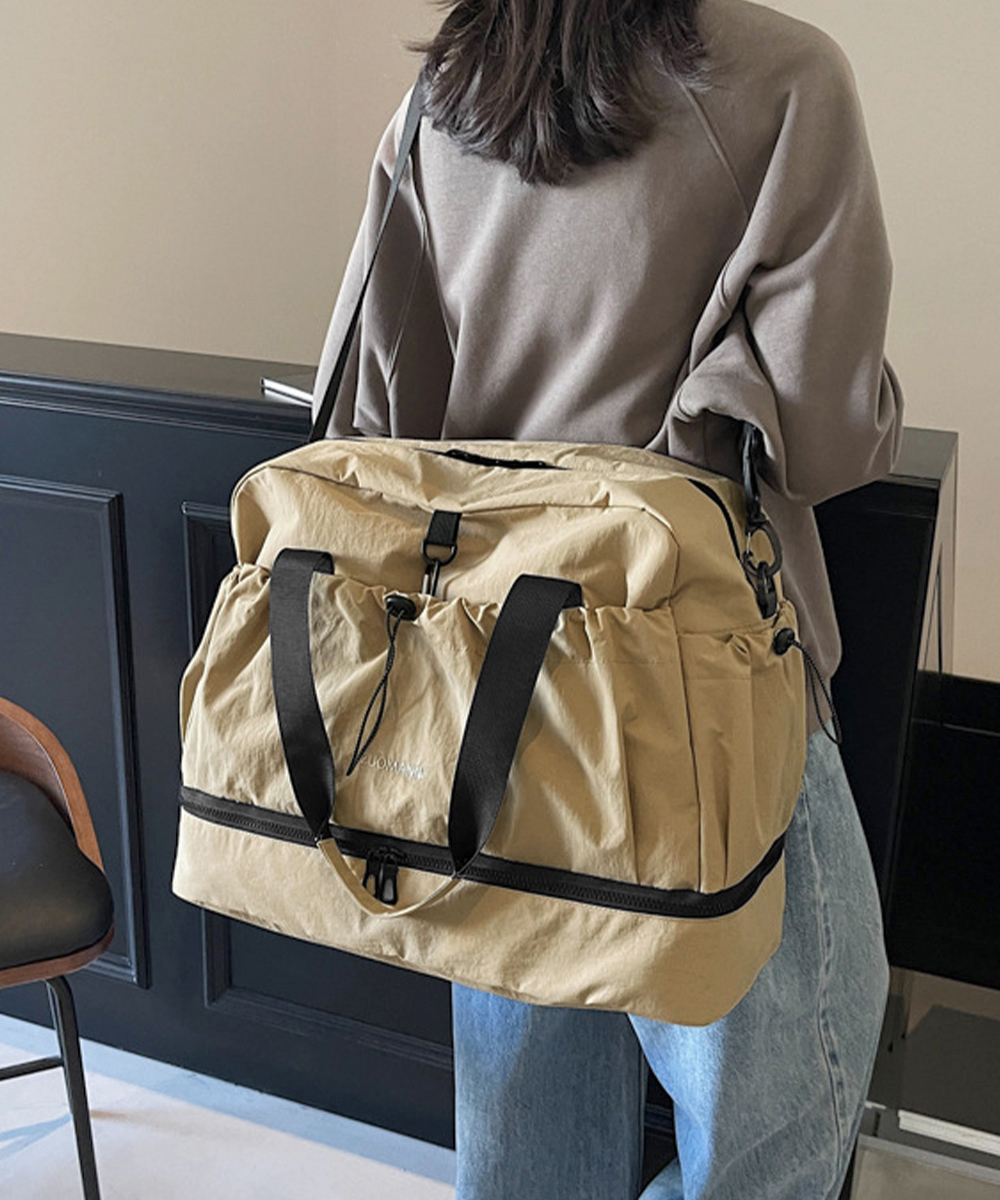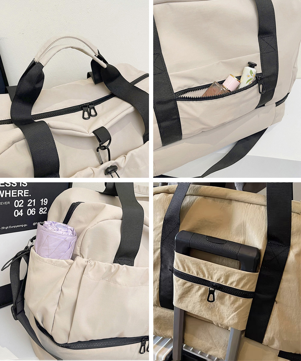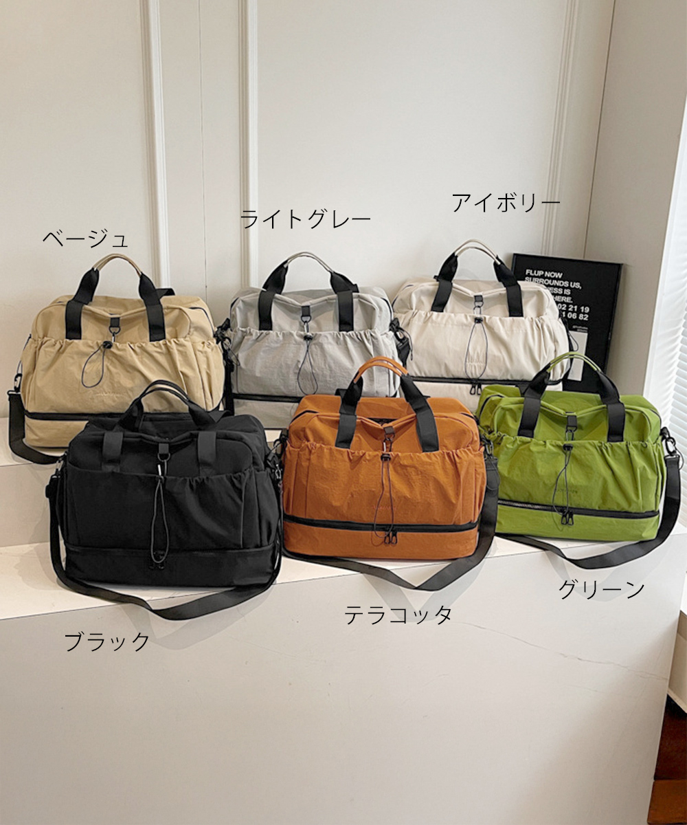 キャリーオンバッグ ナイロンショルダーバッグ 機内持ち込み鞄 1泊2泊3wayバッグ 大容量トートバッグ乾湿分離肩掛け鞄 スポーツバッグ軽量 旅行バッグ修学旅行 ジムバッグおしゃれ ジムやフィットネス、2~3泊程度の旅行など、荷物多めの日に重宝する大容量タイプのボストンバッグ。 ドライウェット分離機能付きで整理しやすく、荷物をすっきり収納。 下部にシューズ収納スペースを備え、衣類と分けて収納できる。 スーツケースのハンドルに通せる背面ポケット付きで、移動中もずれにくく安心。 ハンドルとショルダーストラップ付きの2WAY仕様で、持ち運び方を選べる。 素材:ナイロン+ポリエステル カラー:ブラック/アイボリー/ライトグレー/ベージュ/グリーン/テラコッタ サイズ:ワンサイズ 高さ:約31cm 上横幅:約49cm 底横幅:約46cm マチ:約20cm 持ち手高さ:約28cm 持ち手長さ:約63cm(調節不可、取り外し不可) ショルダー:約46-86cm(調節可、取り外し可) ■収納について ・A4対応(22×31cm):〇 ・iPadmini対応(19.6×13.5×0.7cm):〇 ・長財布(10×20cm):〇 ・二つ折り財布:〇 ・キーケース:〇 ・ペットボトル横向き(500ml):〇 ・ペットボトル縦向き(500ml):〇 重さ:約535g 裏地:あり 内ポケット:あり