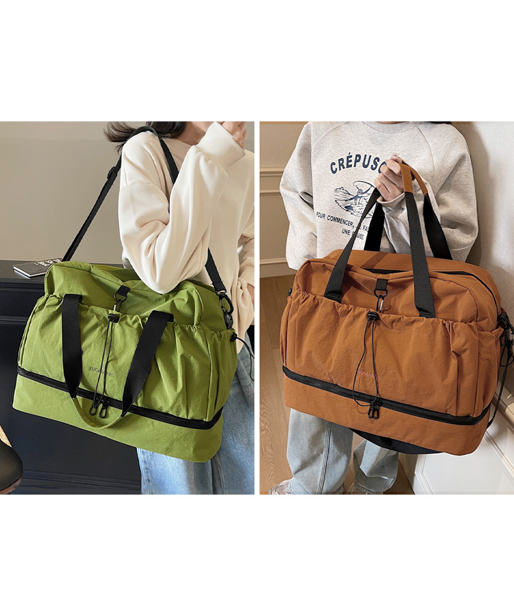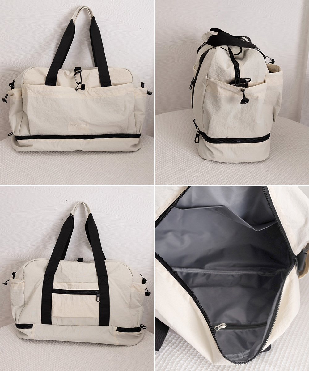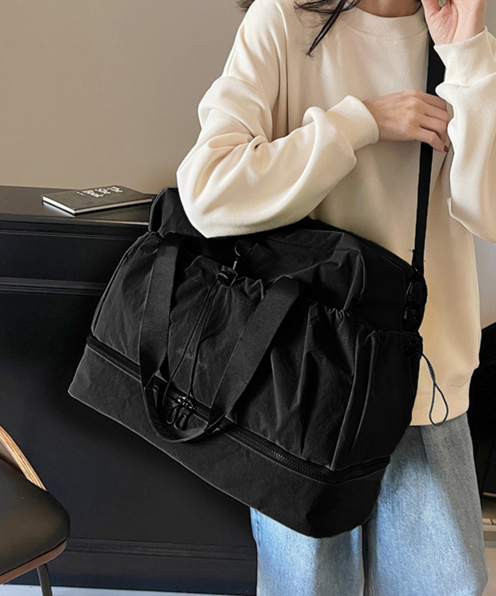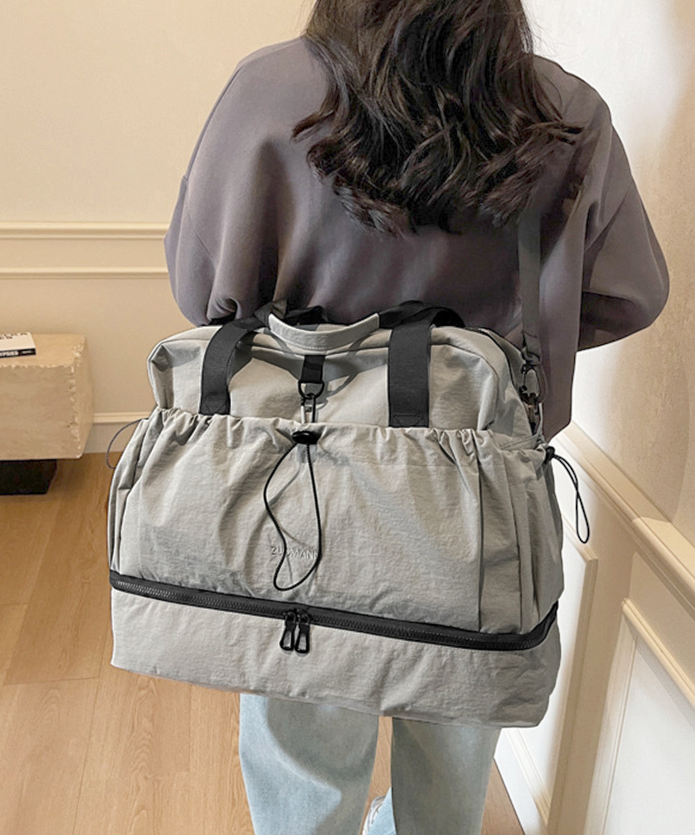 キャリーオンバッグ ナイロンショルダーバッグ 機内持ち込み鞄 1泊2泊3wayバッグ 大容量トートバッグ乾湿分離肩掛け鞄 スポーツバッグ軽量 旅行バッグ修学旅行 ジムバッグおしゃれ ジムやフィットネス、2~3泊程度の旅行など、荷物多めの日に重宝する大容量タイプのボストンバッグ。 ドライウェット分離機能付きで整理しやすく、荷物をすっきり収納。 下部にシューズ収納スペースを備え、衣類と分けて収納できる。 スーツケースのハンドルに通せる背面ポケット付きで、移動中もずれにくく安心。 ハンドルとショルダーストラップ付きの2WAY仕様で、持ち運び方を選べる。 素材:ナイロン+ポリエステル カラー:ブラック/アイボリー/ライトグレー/ベージュ/グリーン/テラコッタ サイズ:ワンサイズ 高さ:約31cm 上横幅:約49cm 底横幅:約46cm マチ:約20cm 持ち手高さ:約28cm 持ち手長さ:約63cm(調節不可、取り外し不可) ショルダー:約46-86cm(調節可、取り外し可) ■収納について ・A4対応(22×31cm):〇 ・iPadmini対応(19.6×13.5×0.7cm):〇 ・長財布(10×20cm):〇 ・二つ折り財布:〇 ・キーケース:〇 ・ペットボトル横向き(500ml):〇 ・ペットボトル縦向き(500ml):〇 重さ:約535g 裏地:あり 内ポケット:あり