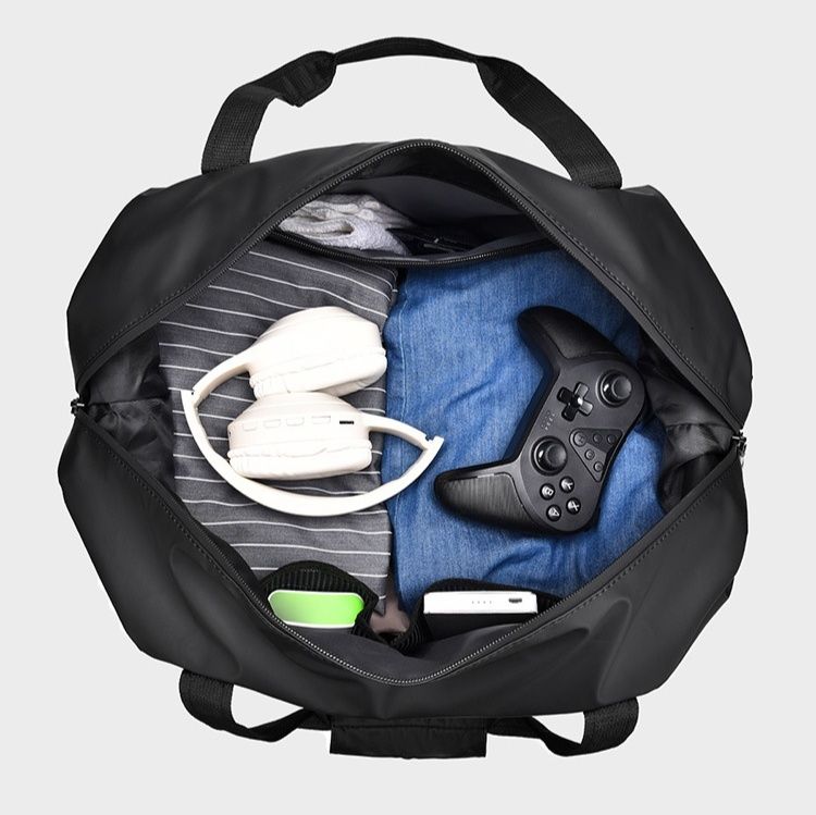フロントとサイドに配置された複数のポケットは小物の整理に便利で、荷札タグも付属しています。